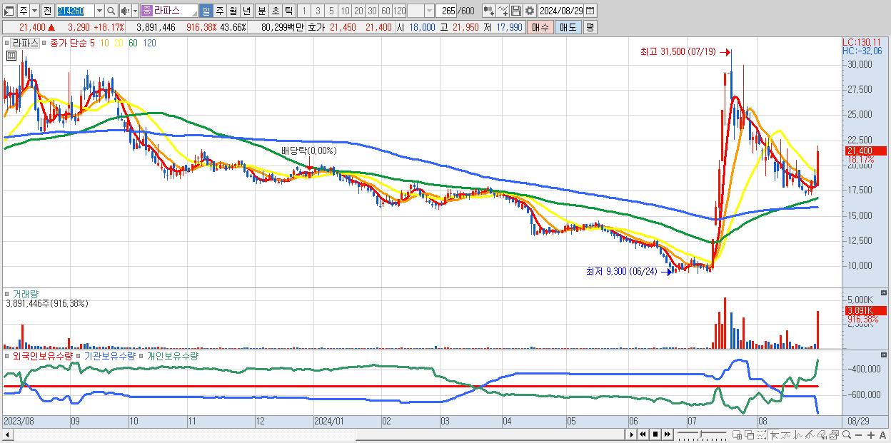 - 라파스 (21,400원 ▲ 18.17% , 시총: 1,907억, 거래량: 3,891,446, 거래대금:803억)