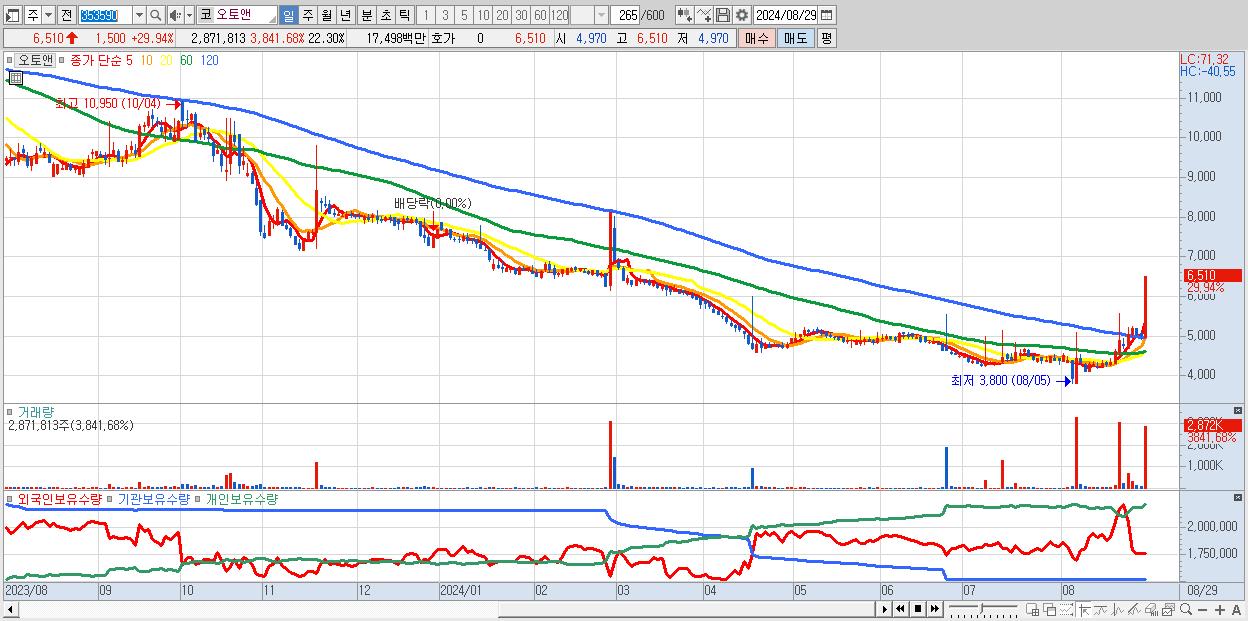 - 오토앤 (6,510원 ▲ 29.94% , 시총: 838억, 거래량: 2,871,813, 거래대금:175억)