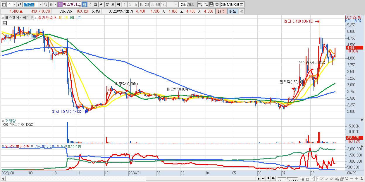 - 에스엘에스바이오 (4,400원 ▲ 10.83% , 시총: 675억, 거래량: 836,295, 거래대금:35억)