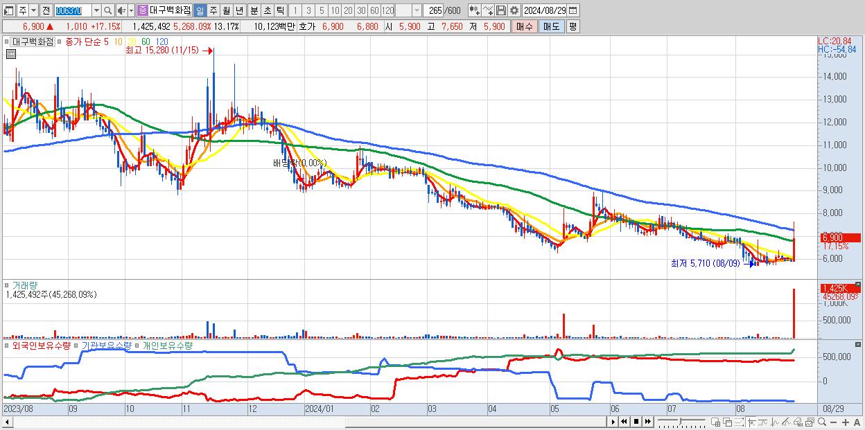 - 대구백화점 (6,900원 ▲ 17.15% , 시총: 747억, 거래량: 1,425,492, 거래대금:101억)