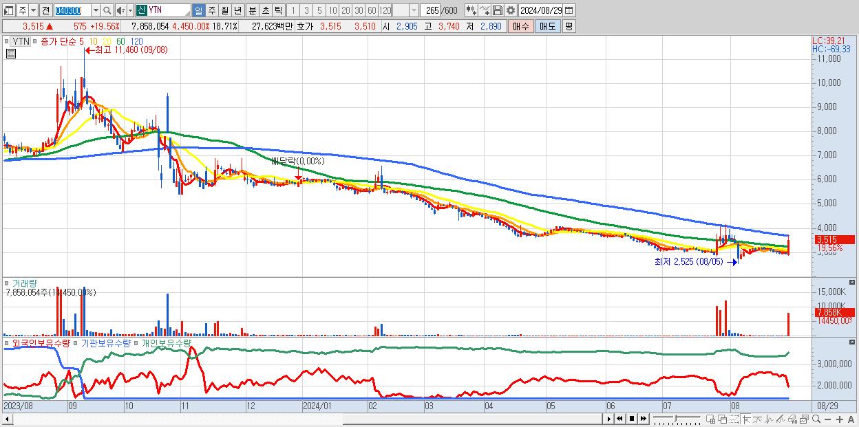 - YTN (3,515원 ▲ 19.56% , 시총: 1,476억, 거래량: 7,858,054, 거래대금:276억)