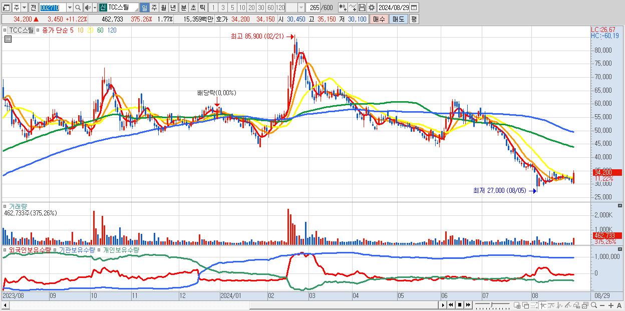- TCC스틸 (34,200원 ▲ 11.22% , 시총: 8,965억, 거래량: 462,733, 거래대금:154억)