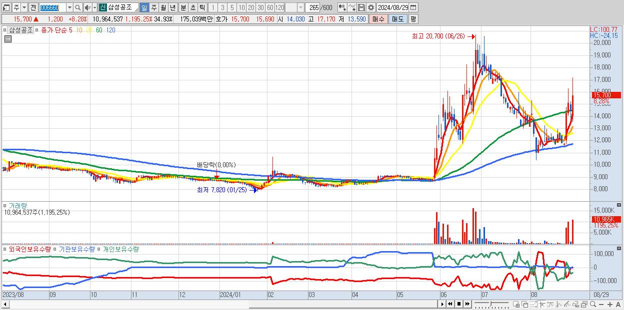 - 삼성공조 (15,700원 ▲ 8.28% , 시총: 1,276억, 거래량: 10,964,537, 거래대금:1,750억)