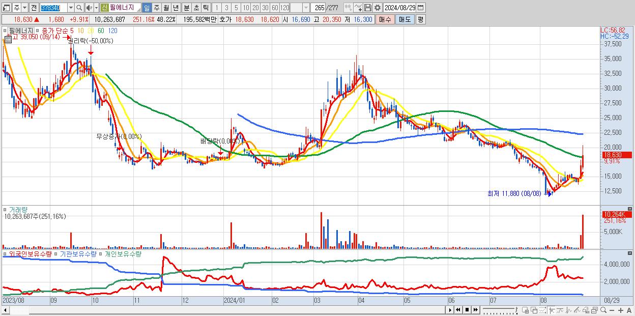 - 필에너지 (18,630원 ▲ 9.91% , 시총: 3,966억, 거래량: 10,263,687, 거래대금:1,956억)