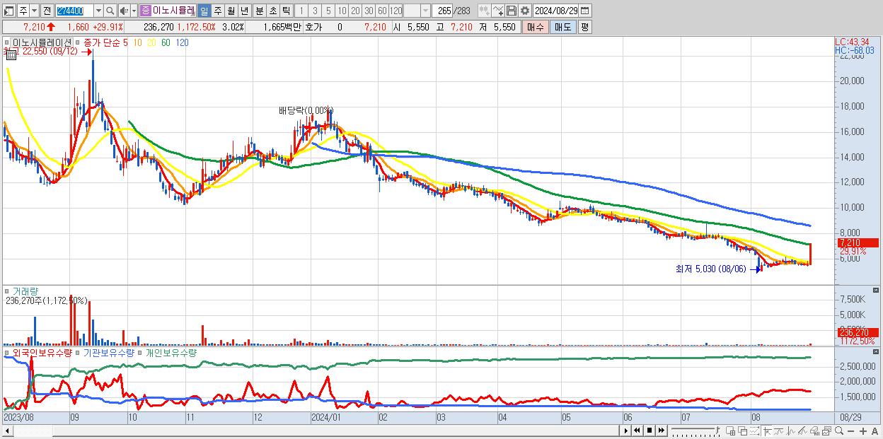 - 이노시뮬레이션 (7,210원 ▲ 29.91% , 시총: 564억, 거래량: 236,270, 거래대금:17억)