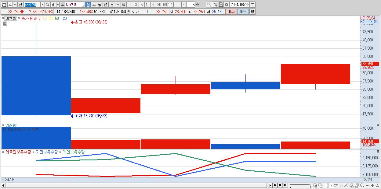 - 이엔셀 (32,750원 ▲ 29.96% , 시총: 3,062억, 거래량: 14,168,348, 거래대금:4,115억)