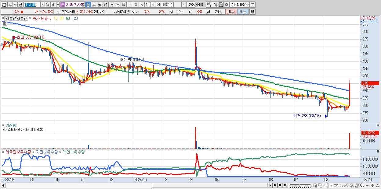 - 서울전자통신 (375원 ▲ 25.42% , 시총: 261억, 거래량: 20,726,649, 거래대금:75억)