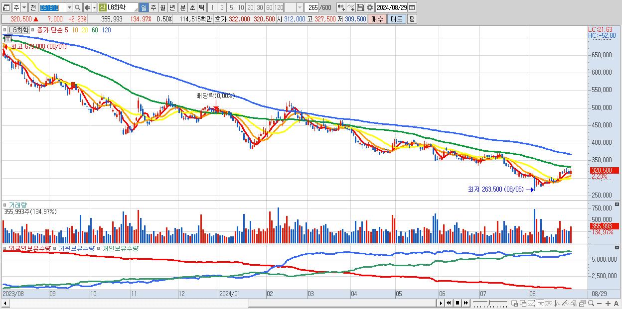 - LG화학 (320,500원 ▲ 2.23% , 시총: 226,248억, 외국인 순매수 거래금:80억)
