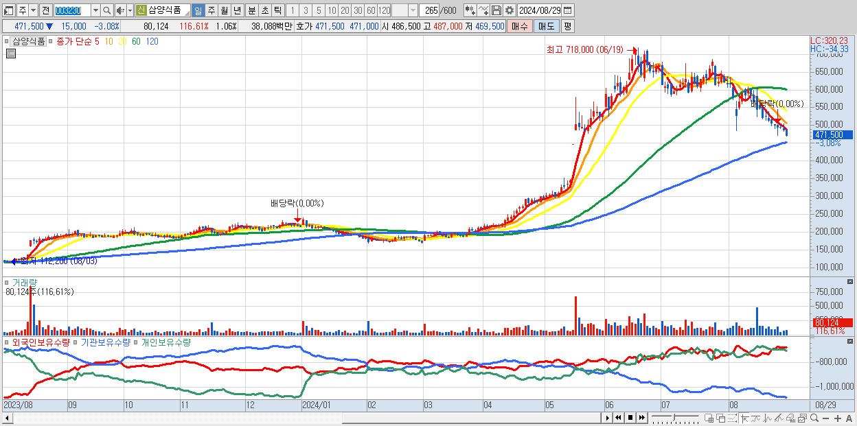- 삼양식품 (471,500원 ▼ -3.08% , 시총: 35,518억, 외국인 순매수 거래금:100억)