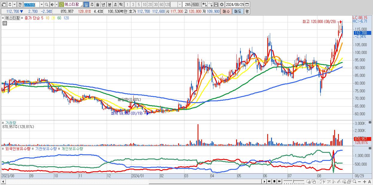 - 에스티팜 (112,700원 ▼ -2.34% , 시총: 22,181억, 외국인 순매수 거래금:43억)