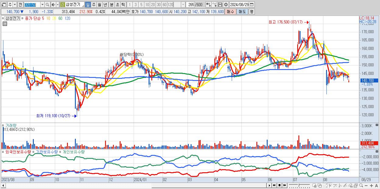 - 삼성전기 (140,700원 ▼ -1.33% , 시총: 105,094억, 외국인 순매수 거래금:87억)