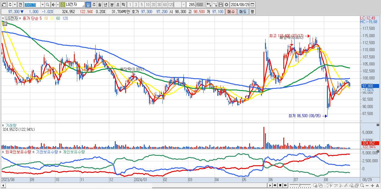 - LG전자 (97,300원 ▼ -1.02% , 시총: 159,229억, 외국인 순매수 거래금:82억)