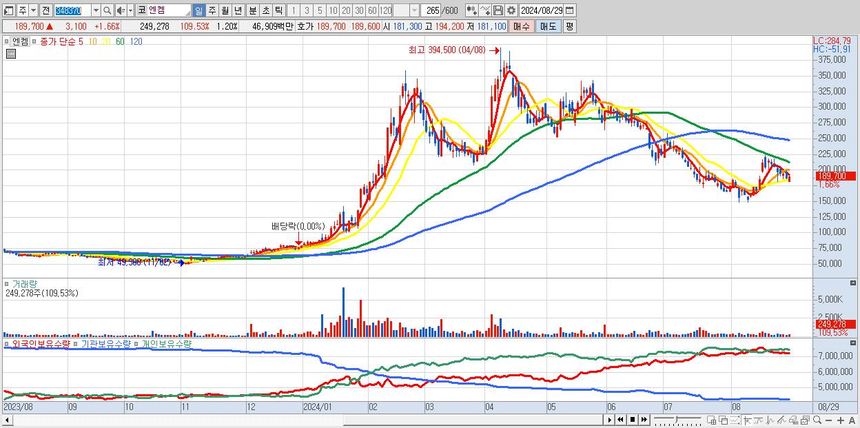 - 엔켐 (189,700원 ▲ 1.66% , 시총: 39,433억, 외국인 순매수 거래금:45억)
