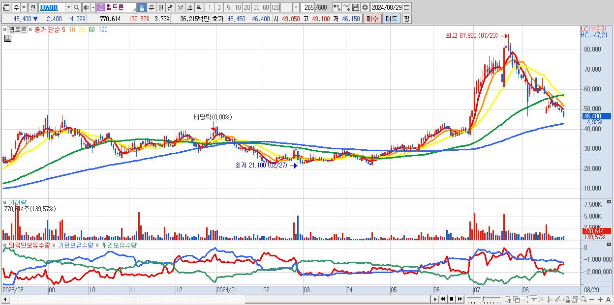 - 펩트론 (46,400원 ▼ -4.92% , 시총: 9,585억, 외국인 순매수 거래금:77억)