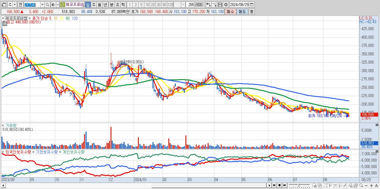 - 에코프로비엠 (168,500원 ▲ 2.06% , 시총: 164,795억, 외국인 순매수 거래금:121억)