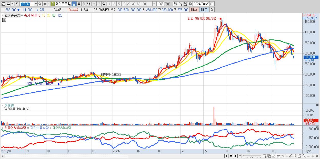 - 효성중공업 (282,000원 ▼ -4.73% , 시총: 26,295억, 외국인 순매수 거래금:43억)