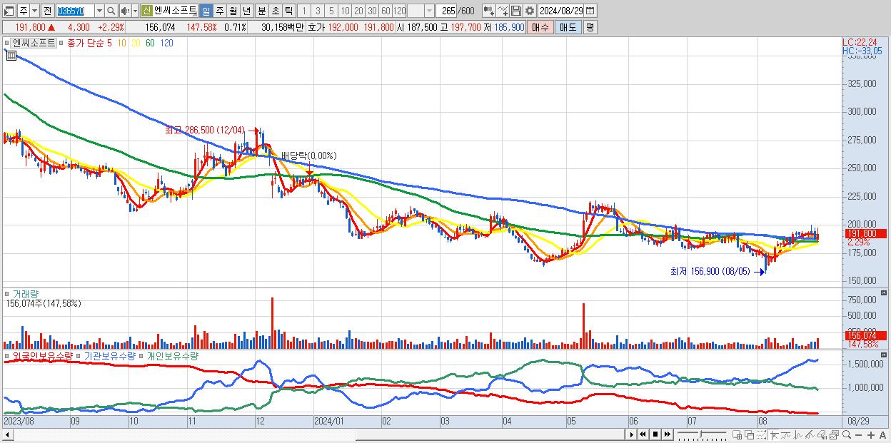 - 엔씨소프트 (191,800원 ▲ 2.29% , 시총: 42,108억, 외국인 순매수 거래금:56억)