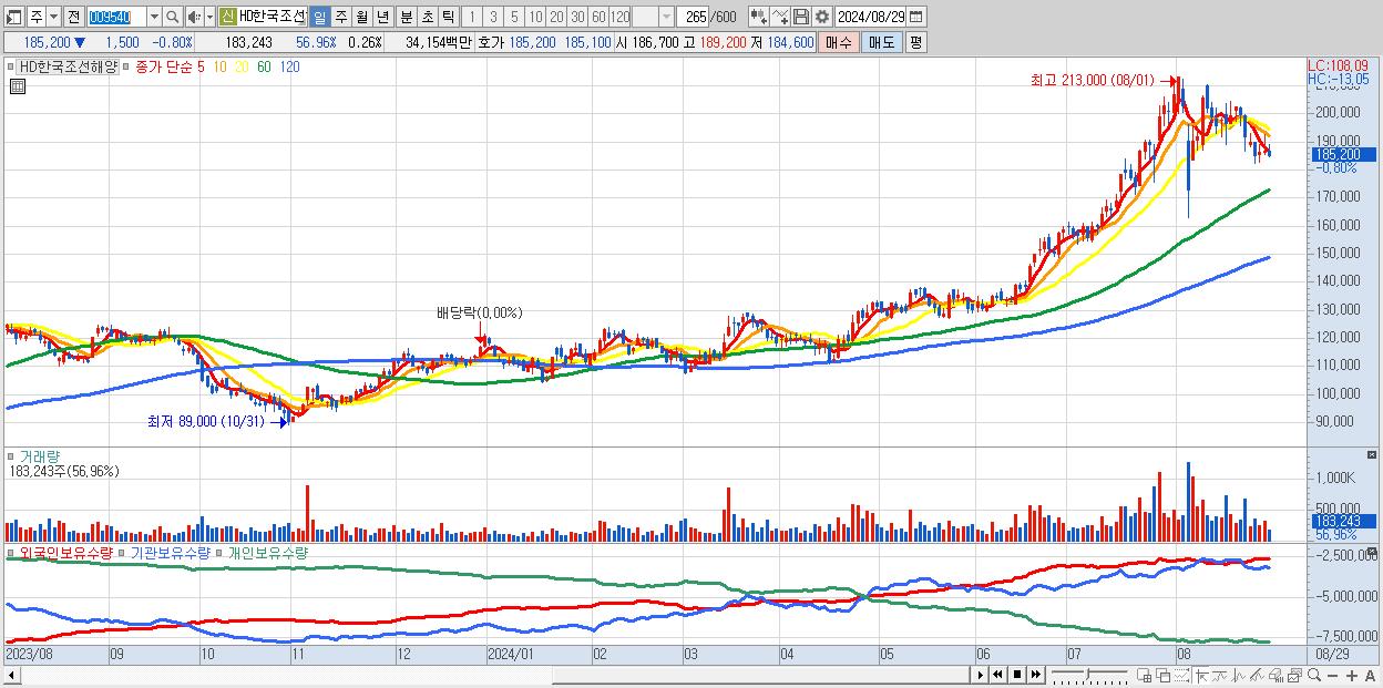 - HD한국조선해양 (185,200원 ▼ -0.8% , 시총: 131,072억, 외국인 순매수 거래금:51억)