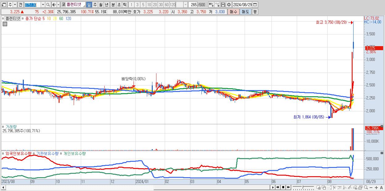 - 플랜티넷 (3,225원 ▲ 2.38% , 시총: 536억, 거래량: 26,002,437, 거래대금:887억, KOSDAQ)