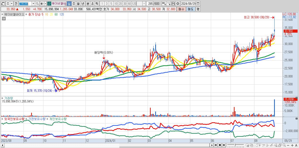 - 에이비엘바이오 (33,950원 ▲ 4.78% , 시총: 16,312억, 거래량: 15,995,123, 거래대금:5,696억, KOSDAQ)