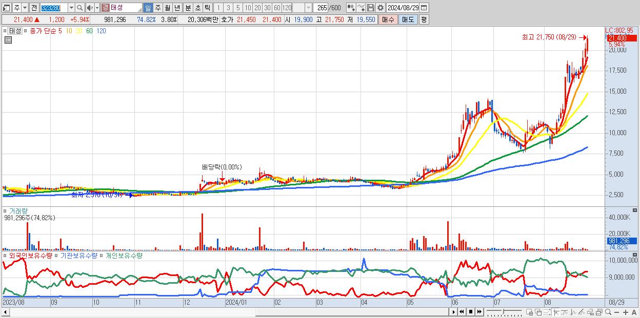 태성 21,400원 ▲ 5.94% (KOSDAQ, 323280)