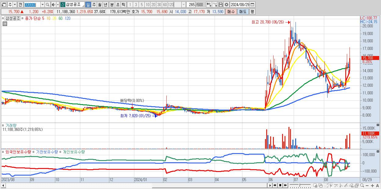 - 삼성공조 (15,700원 ▲ 8.28% , 시총: 1,276억, 거래량: 11,188,360, 거래대금:1,786억)