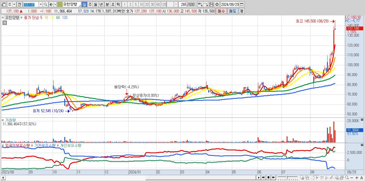 1.유한양행 137,100원 ▲ 1.18% (KOSPI, 000100)