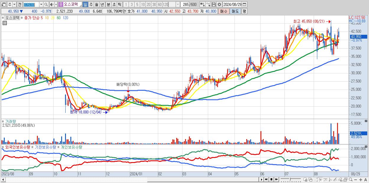 - 오스코텍 (40,950원 ▼ -0.97% , 시총: 15,559억, 거래량: 2,521,233, 거래대금:1,068억)