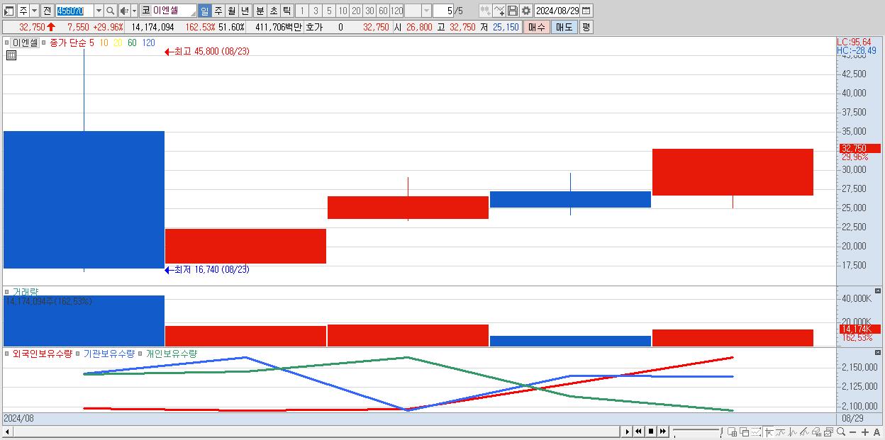- 이엔셀 (32,750원 ▲ 29.96% , 시총: 3,062억, 거래량: 14,174,094, 거래대금:4,117억)
