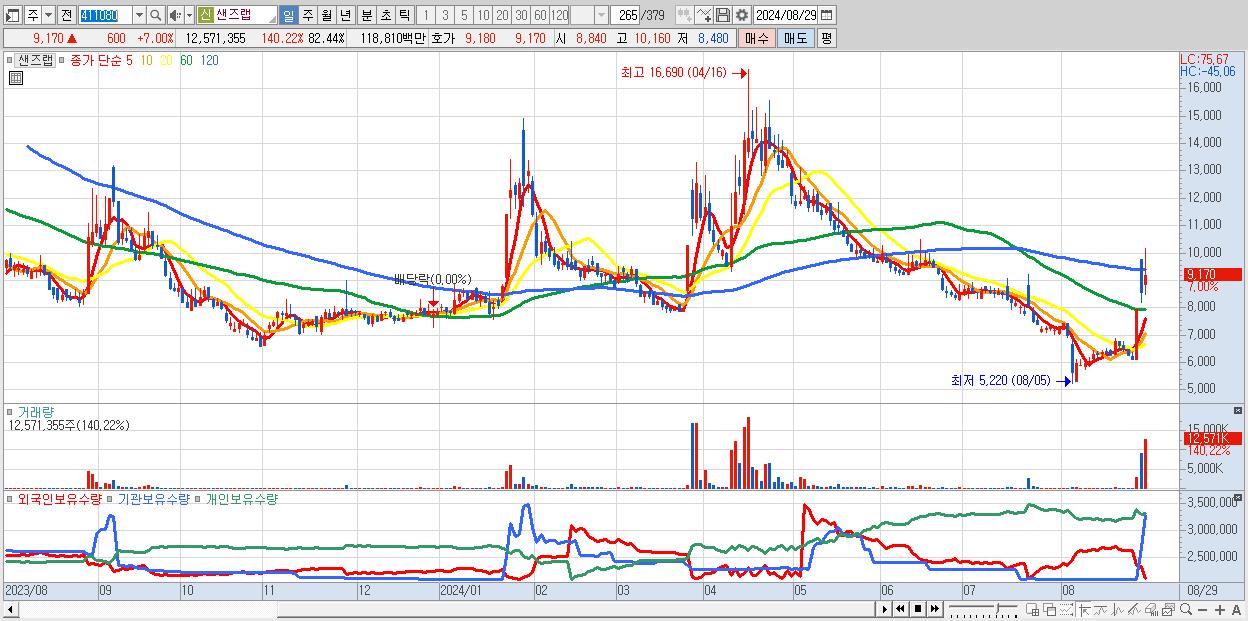 - 샌즈랩 (9,170원 ▲ 7% , 시총: 1,398억, 거래량: 12,571,355, 거래대금:1,188억)