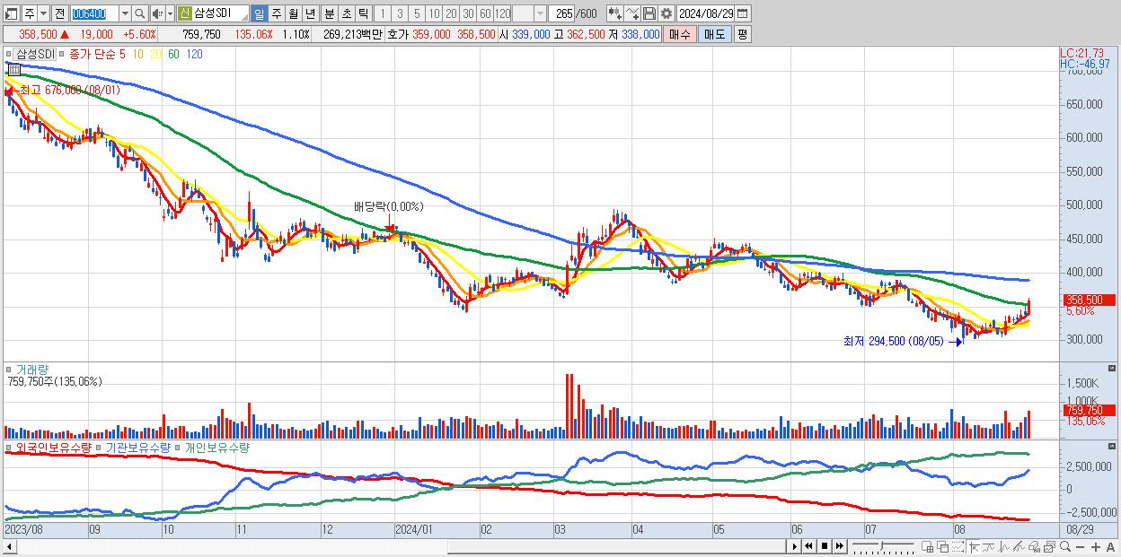 - 삼성SDI (358,500원 ▲ 5.6% , 시총: 246,521억, 거래량: 759,750, 거래대금:2,692억)