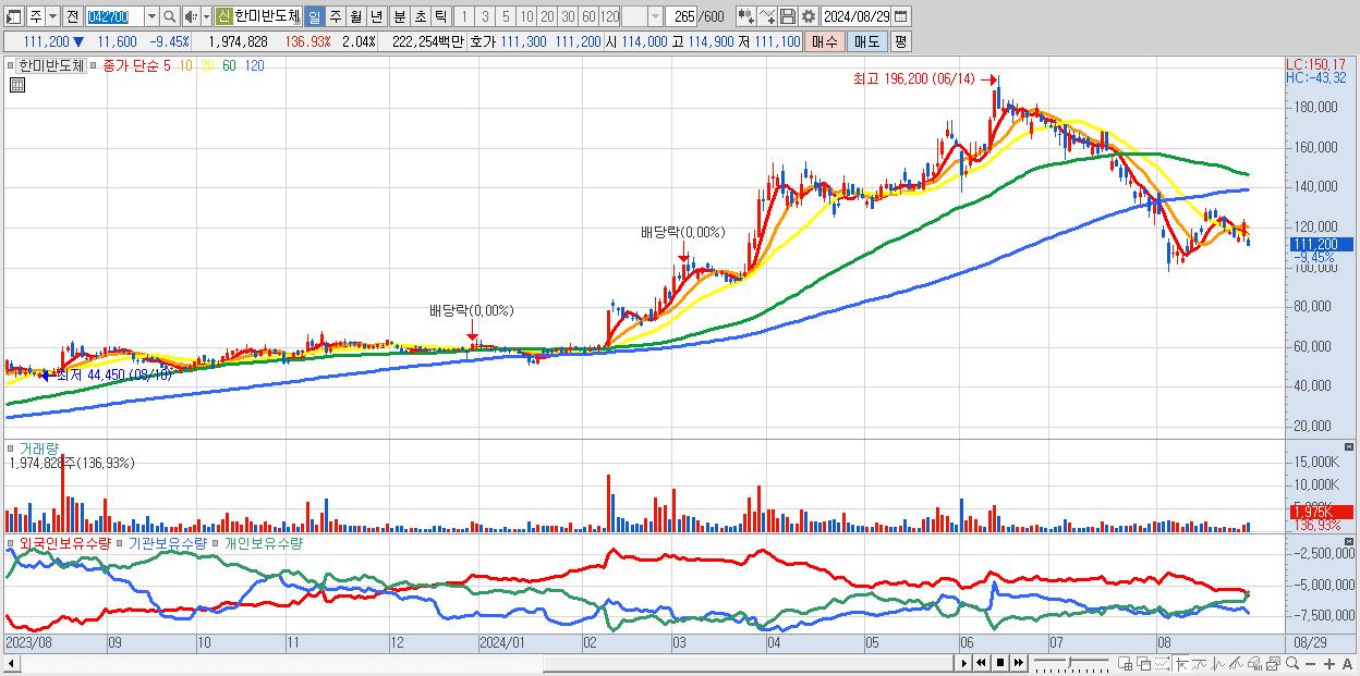 - 한미반도체 (111,200원 ▼ -9.45% , 시총: 107,857억, 거래량: 1,974,828, 거래대금:2,223억)