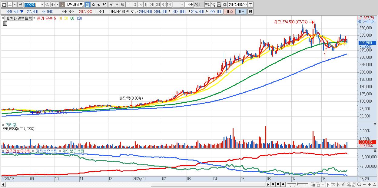 - HD현대일렉트릭 (299,500원 ▼ -6.99% , 시총: 107,961억, 거래량: 656,635, 거래대금:1,967억)