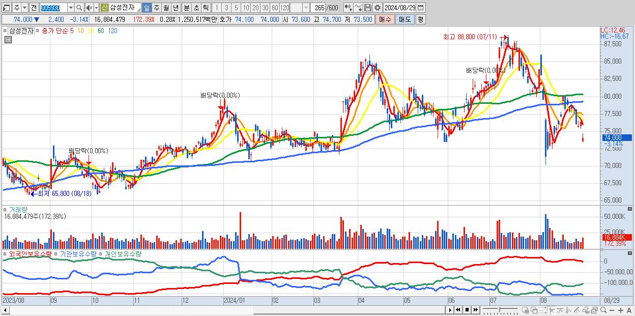 - 삼성전자 (74,000원 ▼ -3.14% , 시총: 4,417,639억, 거래량: 16,884,479, 거래대금:12,505억)