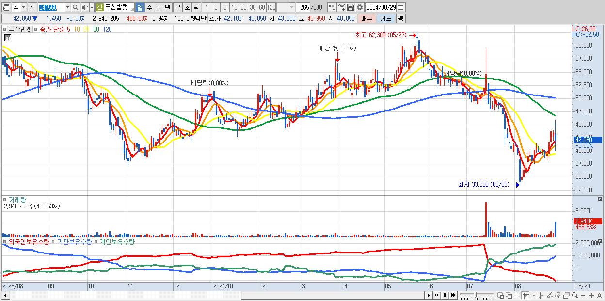 - 두산밥캣 (42,050원 ▼ -3.33% , 시총: 42,155억, 거래량: 2,948,285, 거래대금:1,257억)