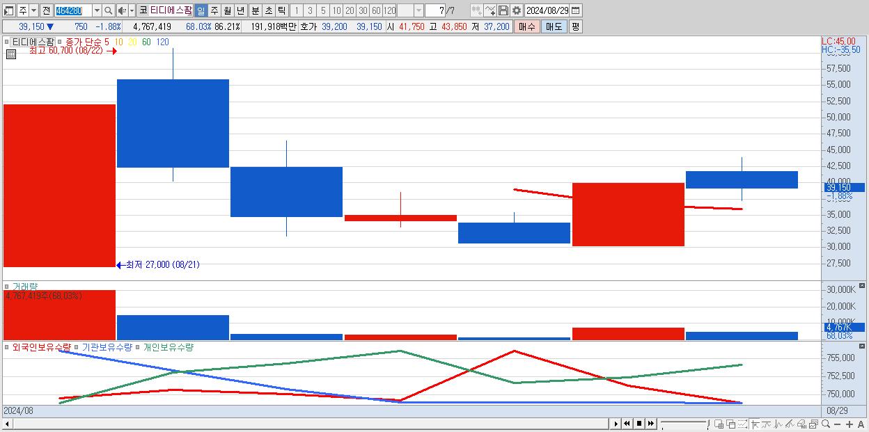 - 티디에스팜 (39,150원 ▼ -1.88% , 시총: 2,165억, 거래량: 4,767,419, 거래대금:1,919억)