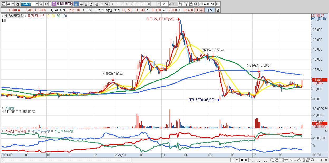 - HLB생명과학 (11,840원 ▲ 13.85% , 시총: 14,051억, 거래량: 4,941,499, 거래대금:577억)