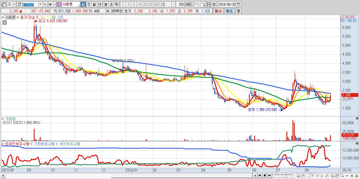 - 샤페론 (2,245원 ▲ 15.84% , 시총: 677억, 거래량: 15,511,532, 거래대금:344억)