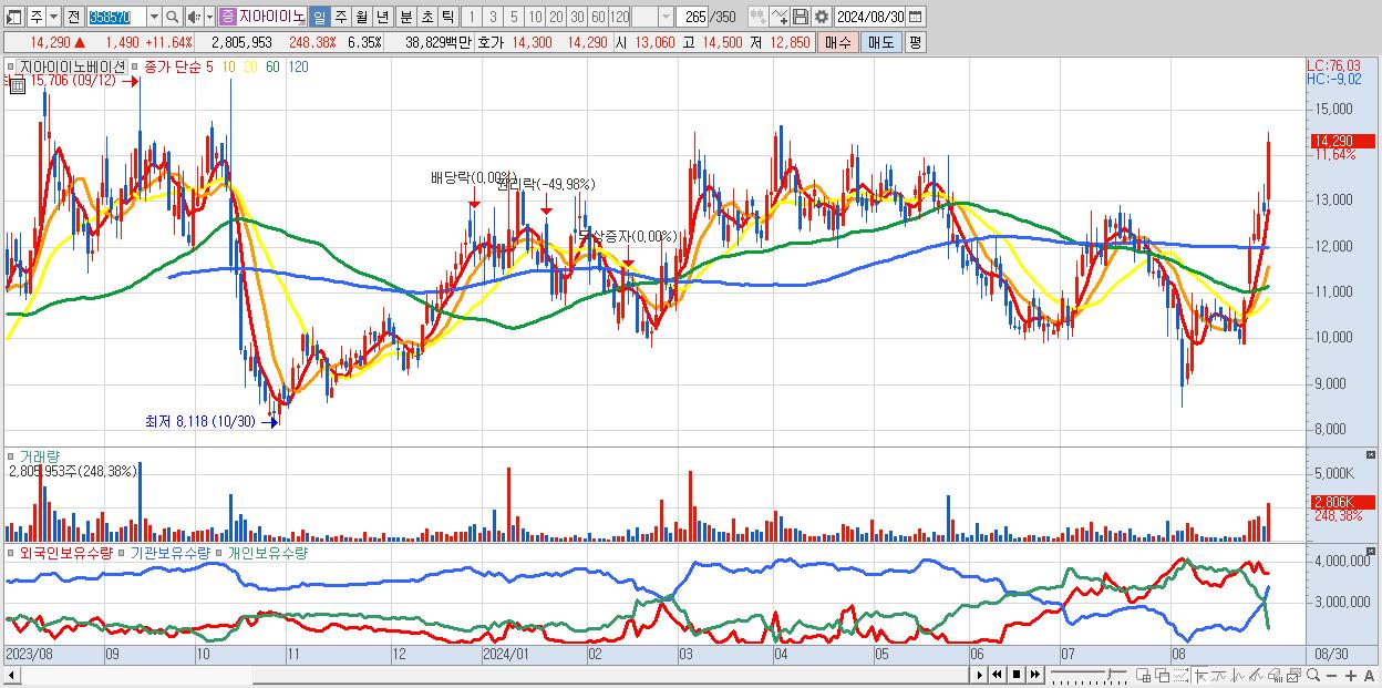 - 지아이이노베이션 (14,290원 ▲ 11.64% , 시총: 6,319억, 거래량: 2,805,953, 거래대금:388억)