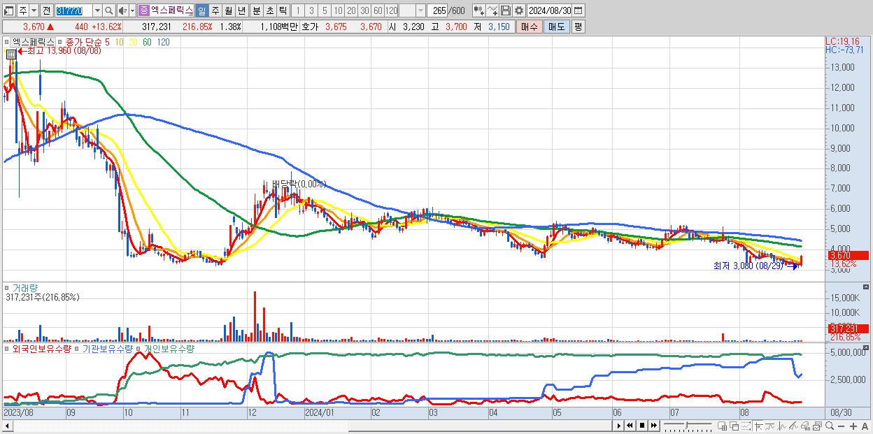 - 엑스페릭스 (3,670원 ▲ 13.62% , 시총: 842억, 거래량: 317,231, 거래대금:11억)