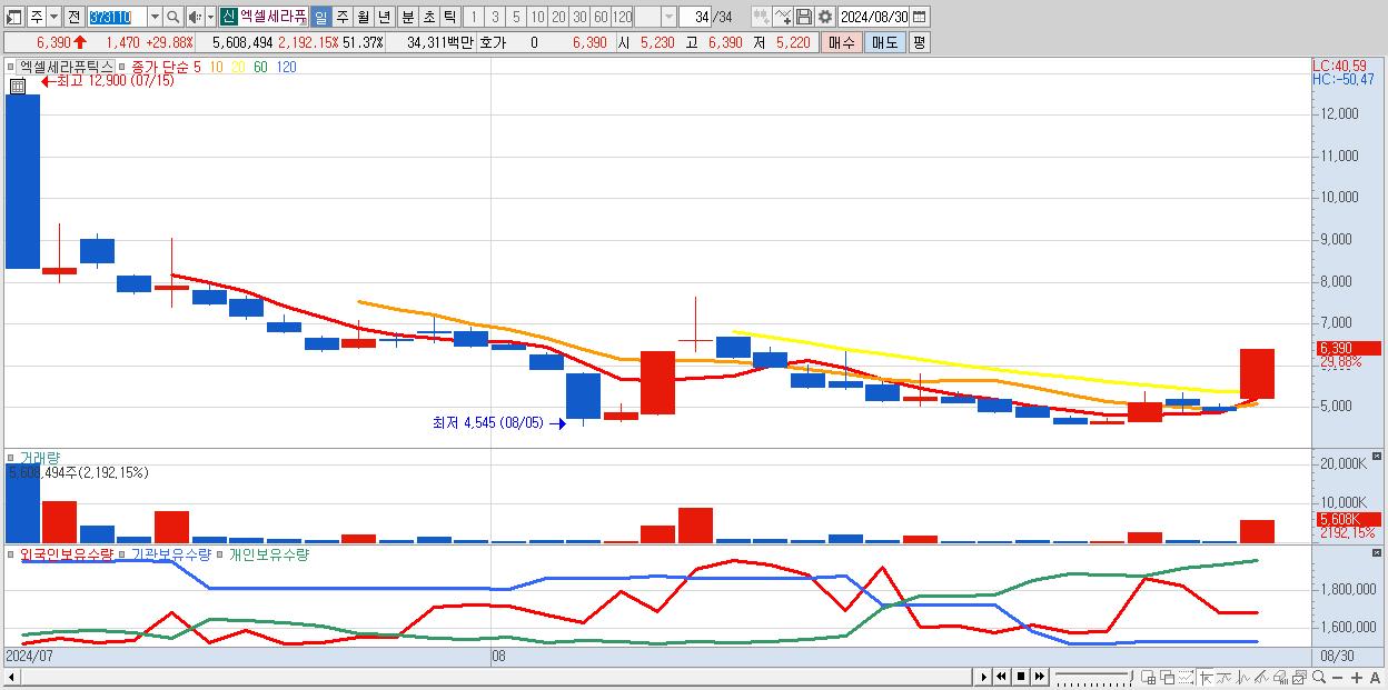 - 엑셀세라퓨틱스 (6,390원 ▲ 29.88% , 시총: 698억, 거래량: 5,608,494, 거래대금:343억)