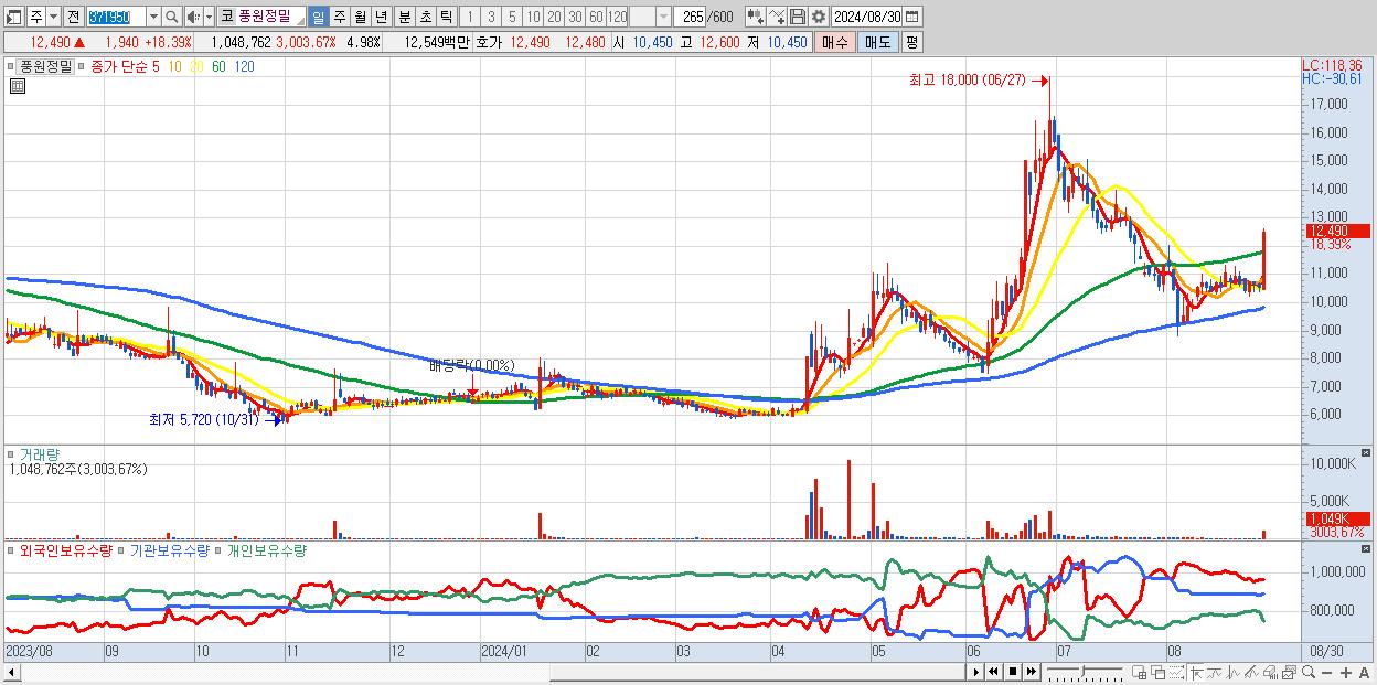 - 풍원정밀 (12,490원 ▲ 18.39% , 시총: 2,628억, 거래량: 1,048,762, 거래대금:125억)