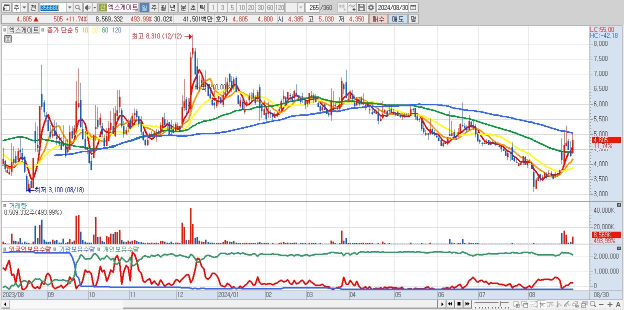 - 엑스게이트 (4,805원 ▲ 11.74% , 시총: 1,372억, 거래량: 8,569,332, 거래대금:415억)