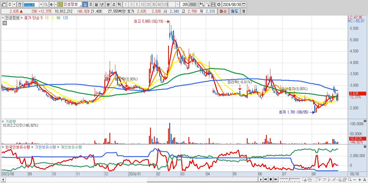 - 인성정보 (2,635원 ▲ 12.37% , 시총: 1,331억, 거래량: 10,812,212, 거래대금:276억)