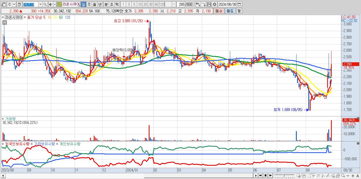 - 라온시큐어 (2,390원 ▲ 14.35% , 시총: 1,339억, 거래량: 30,342,192, 거래대금:751억)