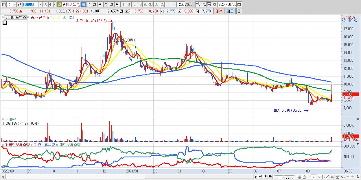 - 위메이드맥스 (8,730원 ▲ 11.49% , 시총: 2,907억, 거래량: 1,392,195, 거래대금:127억)