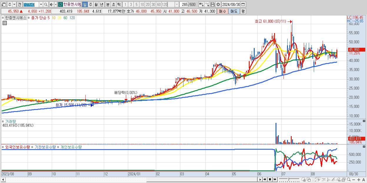 - 한중엔시에스 (45,950원 ▲ 11.26% , 시총: 4,021억, 거래량: 403,419, 거래대금:179억)