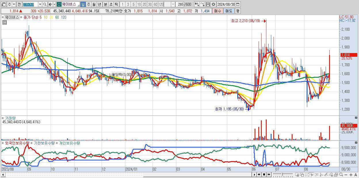 - 웨이버스 (1,814원 ▲ 20.53% , 시총: 874억, 거래량: 45,340,440, 거래대금:782억)
