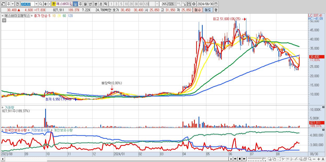 - 에스바이오메딕스 (30,400원 ▲ 17.83% , 시총: 3,488억, 거래량: 827,911, 거래대금:248억)