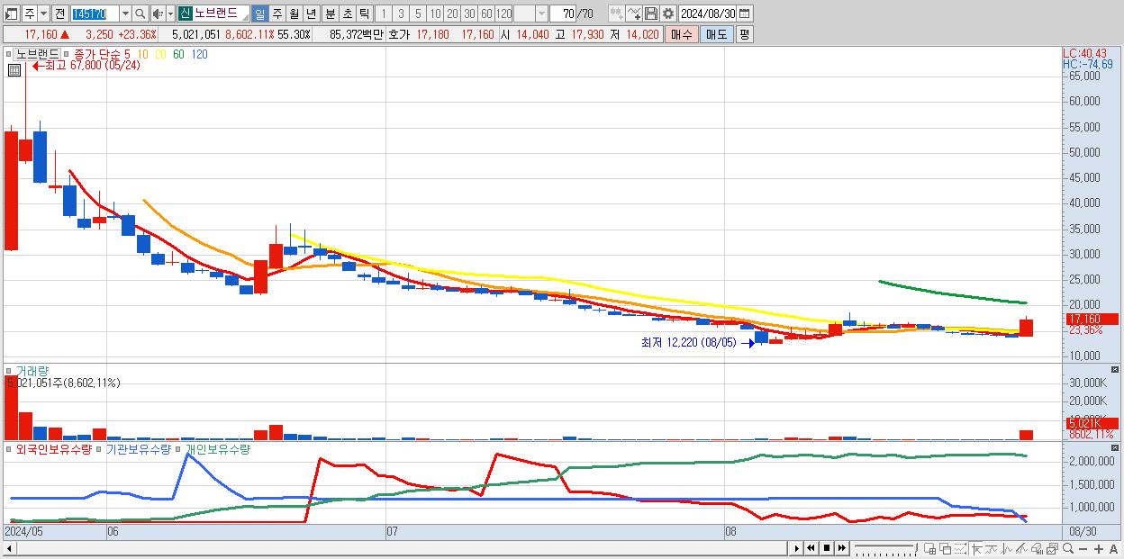 - 노브랜드 (17,160원 ▲ 23.36% , 시총: 1,558억, 거래량: 5,021,051, 거래대금:854억)